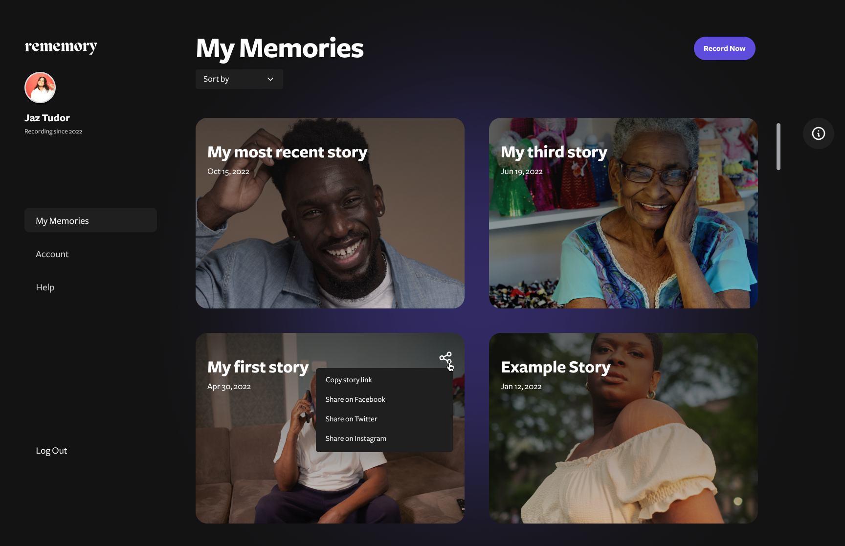 For Rememory, I led product and visual design for an app that helps people preserve memories and share intergenerational stories. The experience was designed to be both emotionally resonant and intuitive.